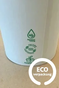 Zertifizierungen: Entspricht BPI, EU-Norm DIN EN 13432 und USA-Norm ASTM D 6400; für direkten Kontakt mit Speisen und Getränken zugelassen
