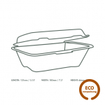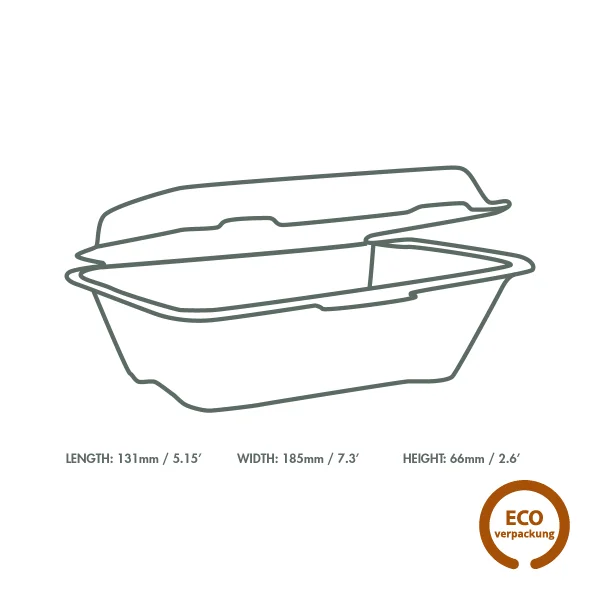 Mit einem Fassungsvermögen von 600 ml bietet die kompakte Box ausreichend Platz für vielfältige Anwendungen in Gastronomie, Streetfood oder bei Events. Sie ist industriell kompostierbar und erfüllt alle relevanten Umweltstandards (DIN EN 13432, ASTM D 6400, BPI). Ihre natürliche Materialzusammensetzung sorgt dafür, dass Speisen länger frisch bleiben – ganz ohne Kunststoff.