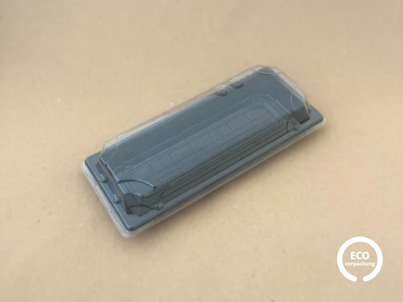 Die PET Sushi Schale mit den Maßen 23 × 10,2 × 3 cm ist die perfekte Lösung zum Servieren und Transportieren von Sushi, Salaten, Desserts und kalten Speisen.